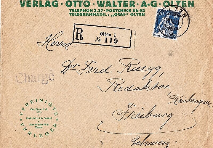 Der Otto Walter Verlag, vermutlich Otto Walter persönlich, schickte am 29. März 1923 an Ferdinand Rüegg einen eingeschriebenen Brief. Der Inhalt des Briefes ist nicht überliefert. Erhalten geblieben aber ist das Couvert, und dieser gelbe Briefumschlag allein verrät eine ganze Menge. Interessant nämlich ist die Beziehung zwischen dem Oltner Verleger und Ferdinand Rüegg in jener Zeit.