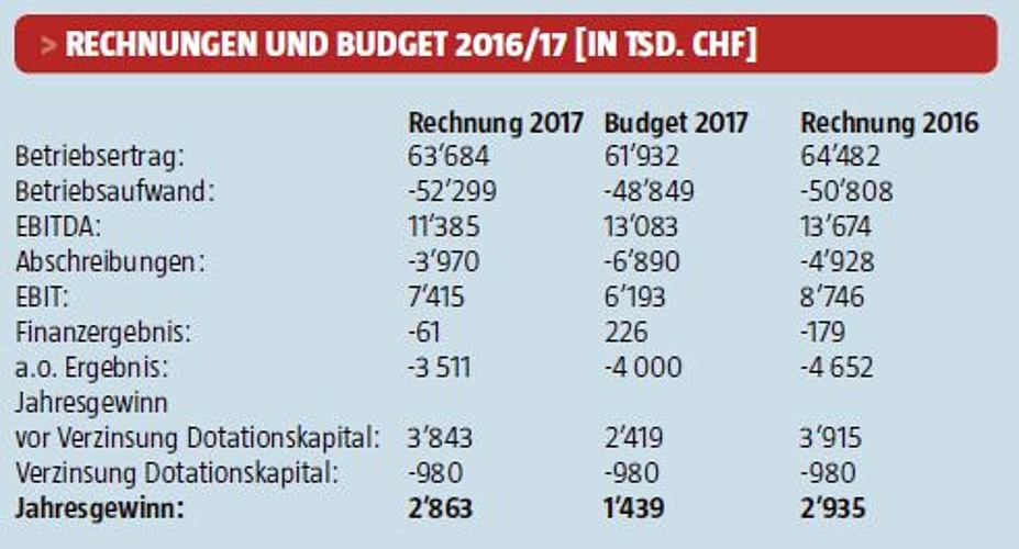 Der bessere Betriebsertrag gegenüber dem Budget ist auf die höheren Umsätze im Geschäfts-bereich Erdgas/Biogas/Wärme zurückzuführen. Der zum Ertrag überproportional gestiegene Betriebsaufwand ist auf den Geschäftsbereich Erdgas/Biogas/Wärme sowie auf den Geschäfts-bereich Wasser zurückzuführen. Die tiefer ausgefallenen ordentlichen Abschreibungen sind in nicht realisierten Investitionen begründet. Schlussendlich resultiert ein um 1.2 Mio. CHF höheres Betriebsergebnis gegenüber dem Budget. Auf Grund der Wertschriftenbewertung (Alpiq-Aktien) fiel das Finanzergebnis negativ und unter dem budgetierten Nettoertrag aus. Beim ausserordentlichen Ergebnis konnten Rückstellungen gebildet und aufgelöst werden. Nach der Verzinsung des Dotationskapitals kann ein Jahresgewinn von 1.4 Mio. CHF über Budget, aber unter dem Gewinn des Vorjahres ausgewiesen werden.